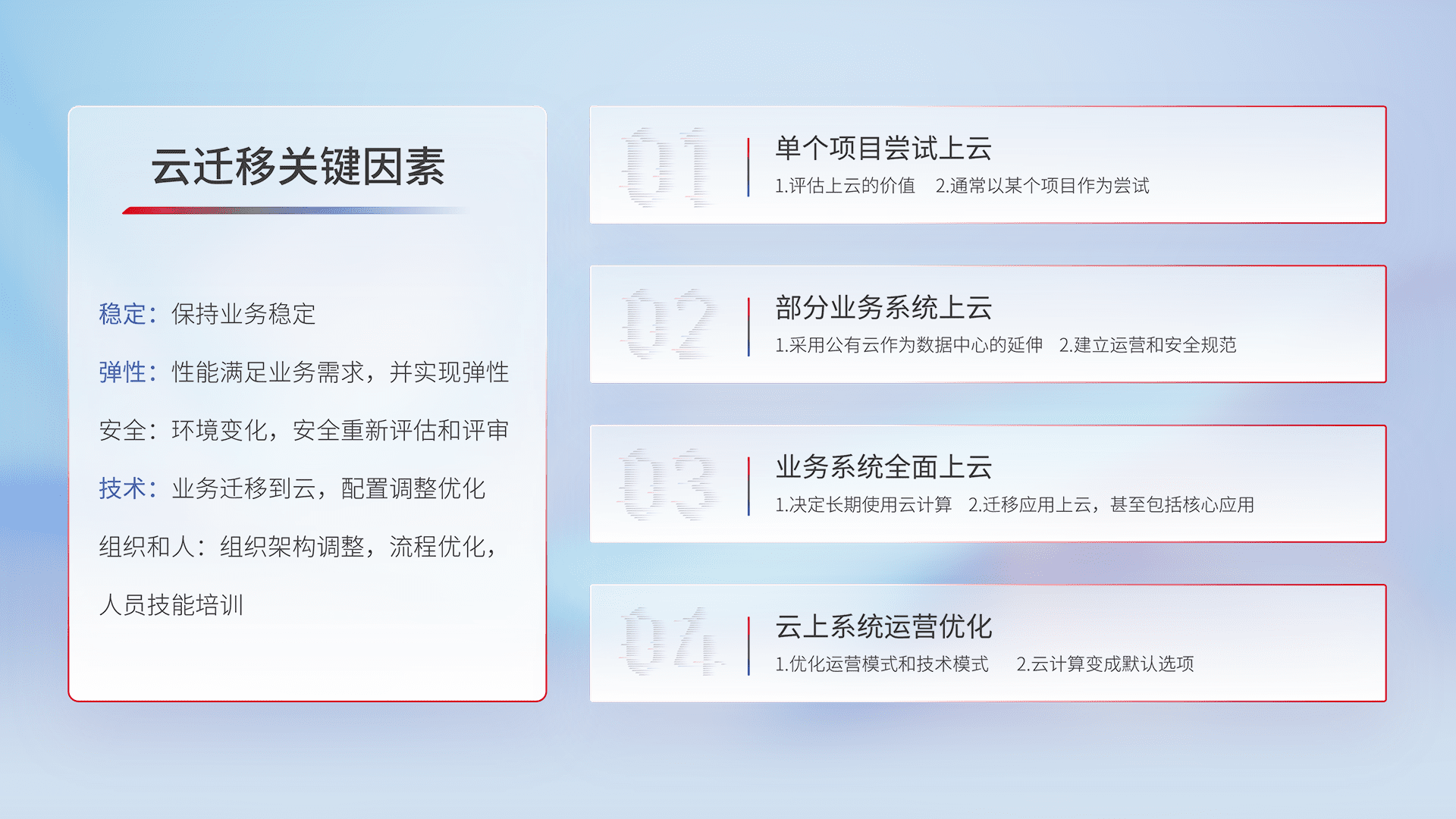 结合实际业务,,,从规划设计、、、云平台选型、、云原生改造、、数据迁移、、、集成交付,,迁移全过程为客户识别最佳上云路径,,,,做好风险识别管理,,,,设计网络架构、、身份权限、、、安全审计合规、、、操作审计、、日志审计、、监控告警策略、、、多站点容灾设计等,,对云上基础设施进行整体规划,,提升IT治理水平,,,,以满足弹性、、高可用、、、、高性能的需求。。
