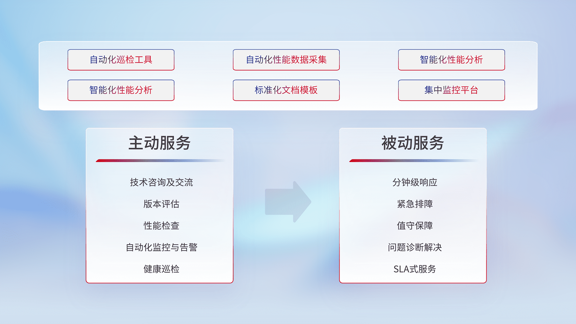 智能化工具和标准化文档,,保障服务质量,,,,提供主动服务(包含技术咨询、、、版本评估、、、性能检查、、、、自动化监控与告警、、、、健康巡检)和被动服务包含(分钟级响应、、、紧急排障、、、、值守保障、、、、问题诊断解决、、SLA服务)。。。。