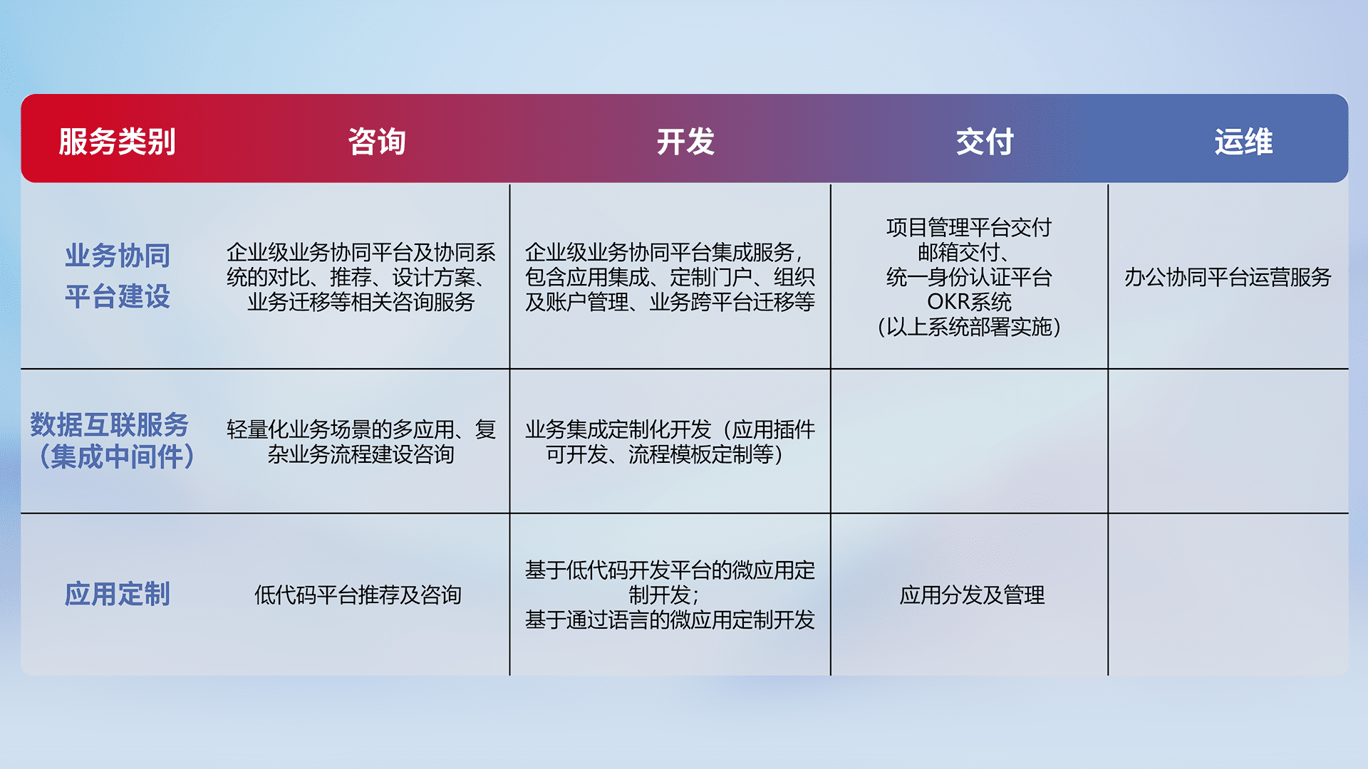 针对钉钉、、企微、、、、IDaas等平台级产品提供产品的规划、、、方案、、、交付、、、定制化开发等服务,,,,实现如统一协同办公、、智能客户服务、、、、混合会议管理、、、智能数据查询、、、、等业务场景,,实现数字化转型。。
